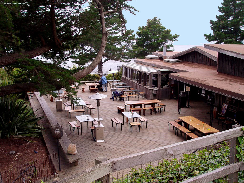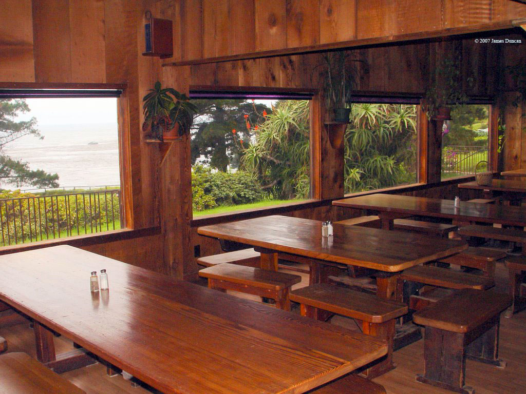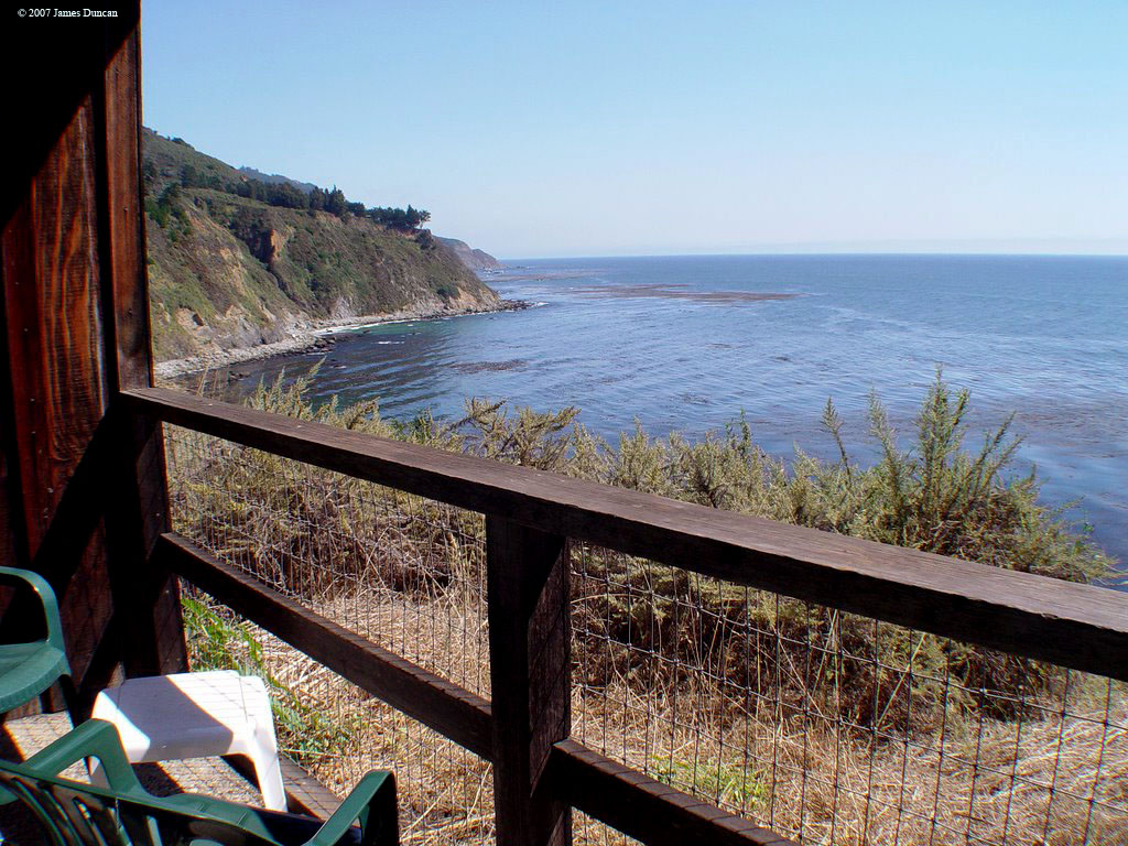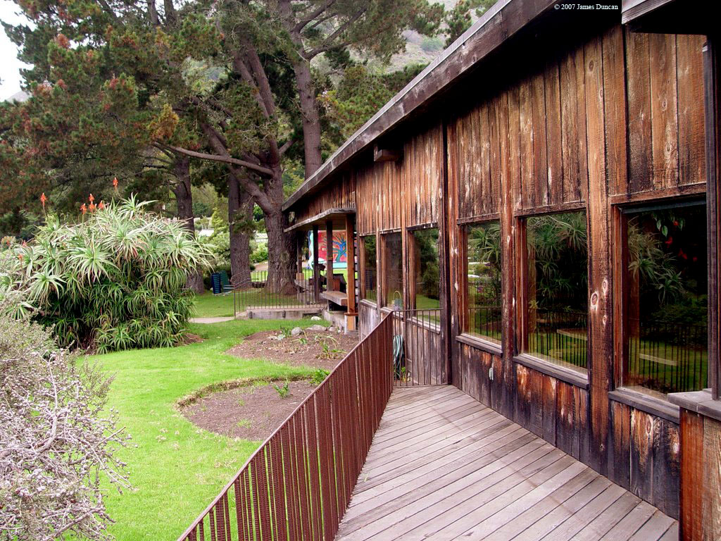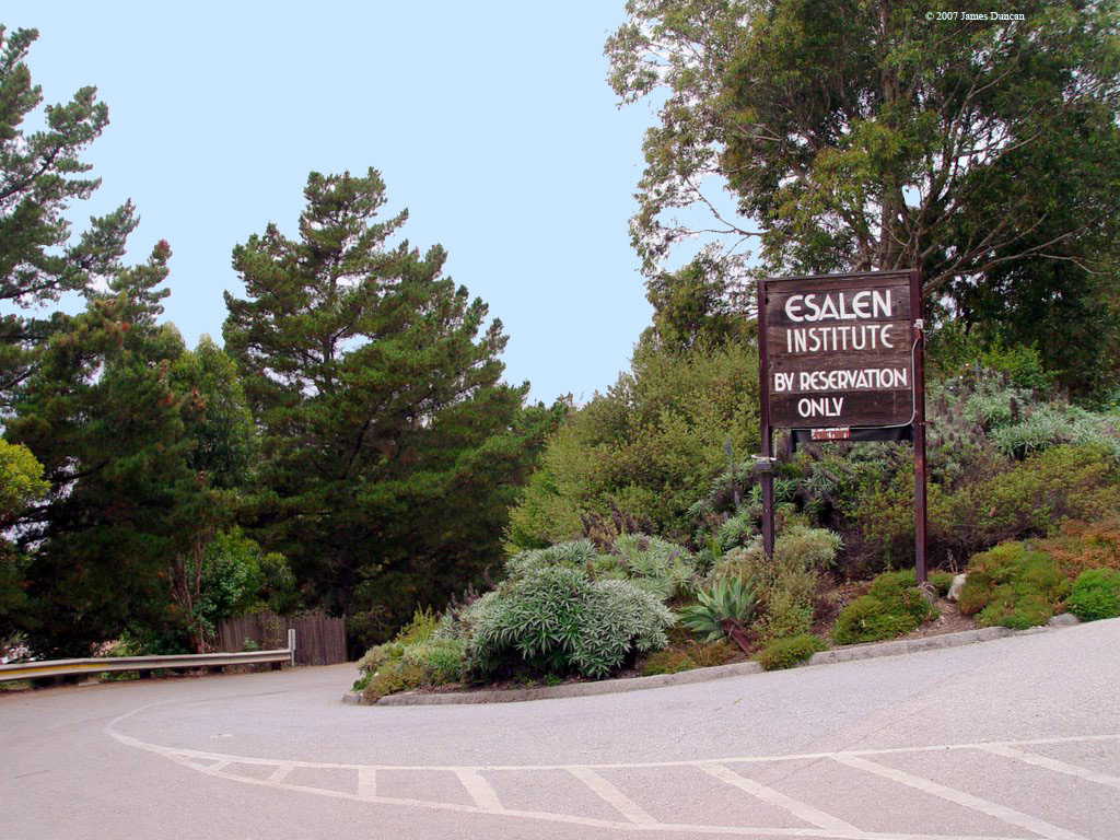 Pacific Ocean and abrupt mountains. A canyon stream cascades through Esalen